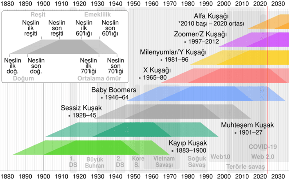 Not : Kuşak tarihleri değişik sosyolog ve tarihçiler tarafından ortak paydada birleşen tarihleri içermekte olup keskin tarihler değillerdir.